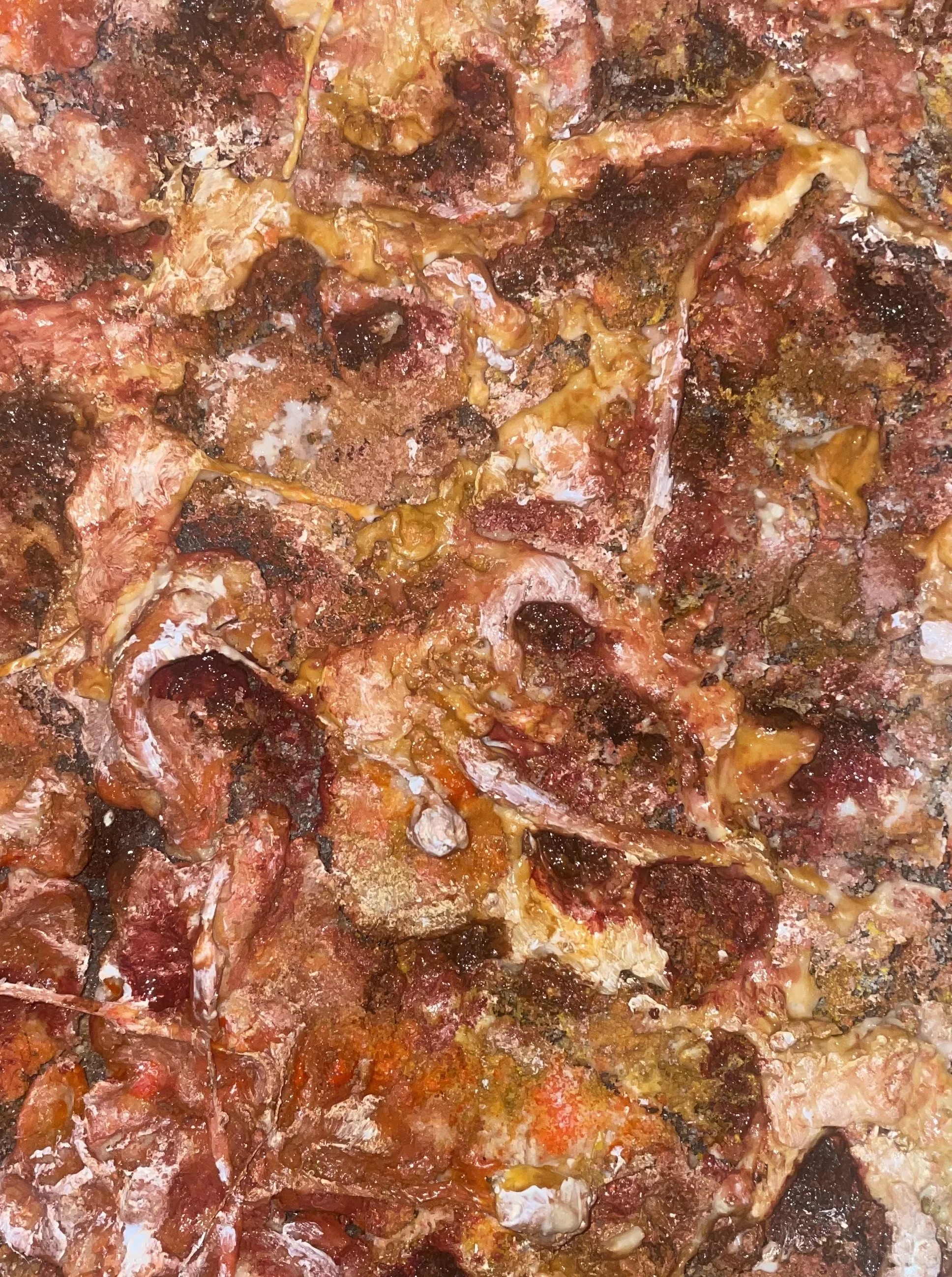 The rust drawing, originally placed beneath the lakes to catch falling debris, now hangs like a geological form. The marks from the debris presents a record of decay. Its colour palette echoes oxidized bronze, green-blue and orange. The forms and patterns mimic rock formations, emphasizing the natural processes that shaped them. The organic patterns, grainy textures and contrasting tones are evenly balanced throughout the composition to mimic those on rocks.